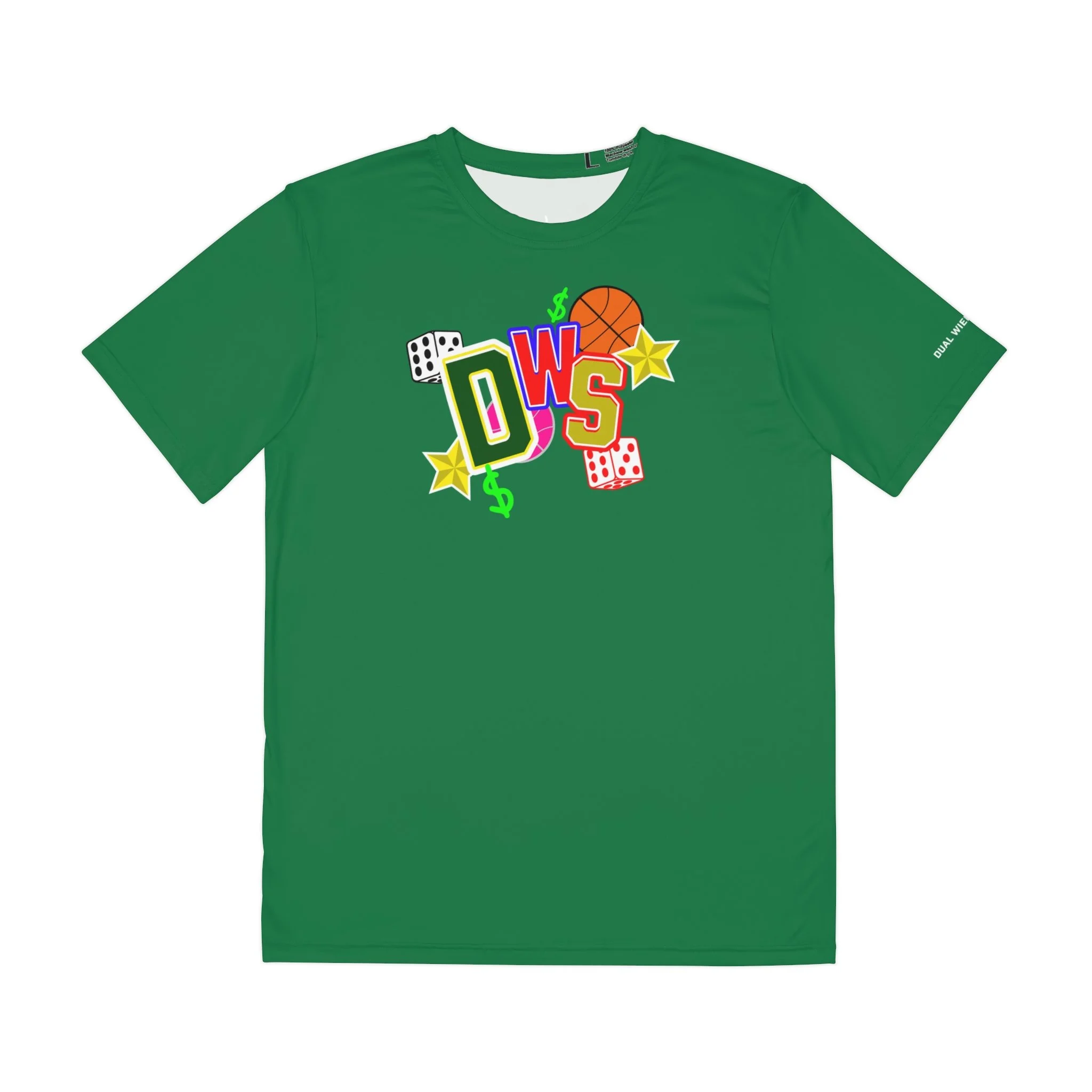 A vibrant all-over-print polyester tee that brings playful street-sport energy to casual days. Bright, layered graphics on the chest—dice, a basketball, dollar signs and bold block letters—pop against a rich green field for a youthful, game-on look. Lightweight and quick-drying, the shirt moves with you through city pick-up games, skate park hangs, or weekend runs. Clean, minimal logo detail on the upper back and a subtle sleeve print give it an authentic crew vibe without loud branding. Breathable and fade-resistant, this tee keeps the design sharp wash after wash so you can wear that confident, competitive mood whenever you step out.